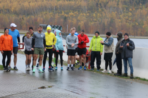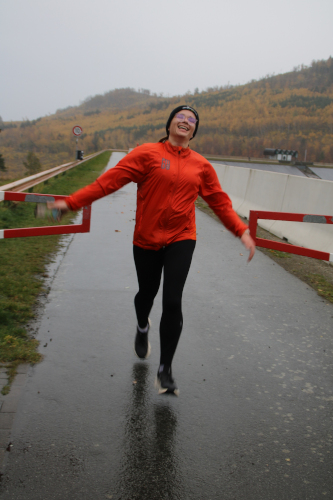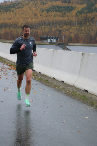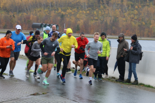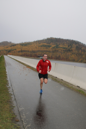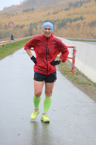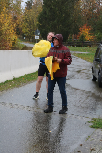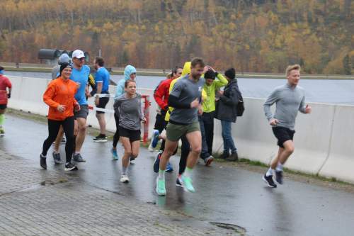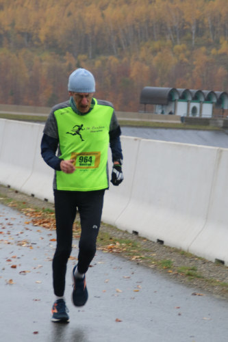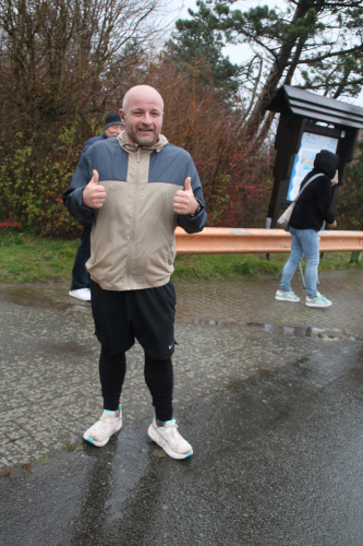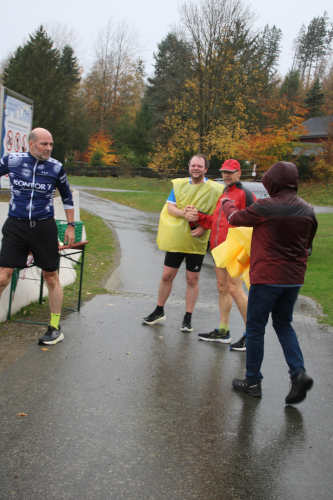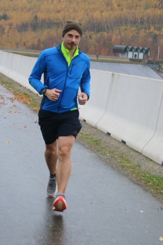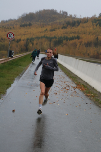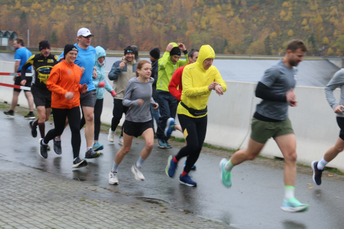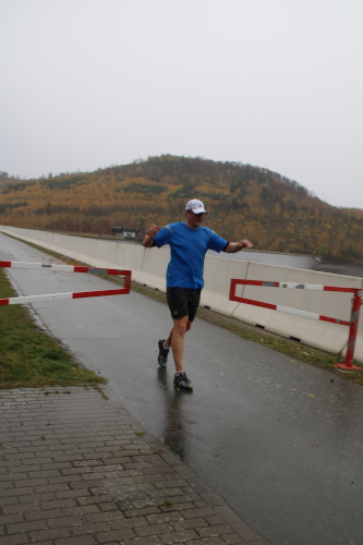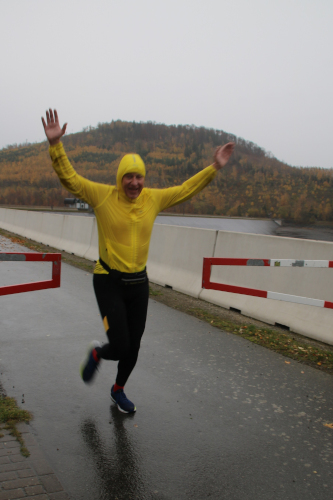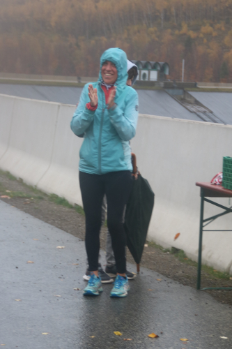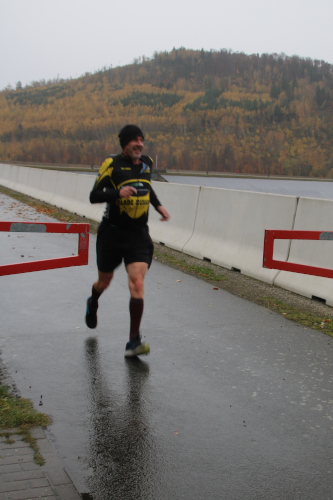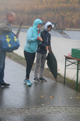 Am Morgen war es noch gut, trocken und leichter Sonnenschein, doch dann fing es an zu nieseln. Später wurde der Regen stärker, dazu kam noch unangenehmer Wind: kein Laufwetter. Pünktlich wurden die beiden Läufe gestartet und es dauerte 22 Minuten da kam Agata von der kleinen Runde zurück. Aus der langen Runde tauchten fast alle einzeln völlig durchnäßt auf der Sperrmauer auf, sogar die Schuhe waren nass.